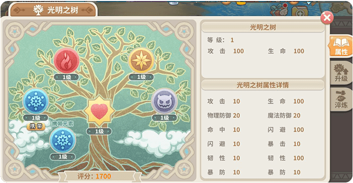 光明之树 —— 卢米娅生命之树, 使用资源能提升光明之树的等级,从而提升人物属性。每棵光明之树会有4片光明树叶,分别为火焰、冰晶、光明、黑暗。提升光明树叶的等级后,除了获得人物属性以外,还会获得火焰、冰晶、光明、黑暗4中元素,根据携带的元素不同,会有额外的伤害加成,光明树叶中的每条属性,还可以进行淬炼,淬炼次数越多,获得的属性也越多。